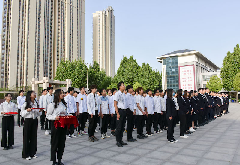 新团员们在校团委老师的带领下,面对鲜艳的团旗坚定地举起右拳,进行了庄严的入团宣誓。