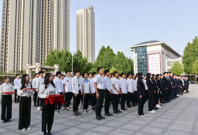 英姿飒爽的国旗护卫队迈着整齐坚定的步伐,以饱满的热情,昂扬的姿态,正步走向升旗台。伴随着庄严的国歌声,入团宣誓仪式正式开始。