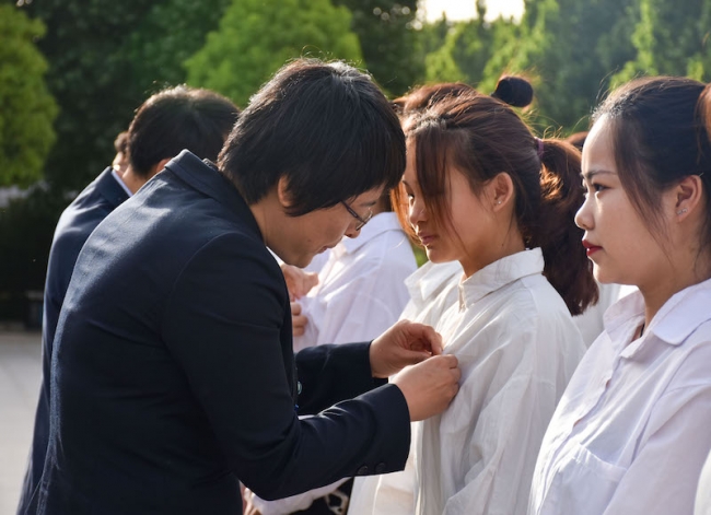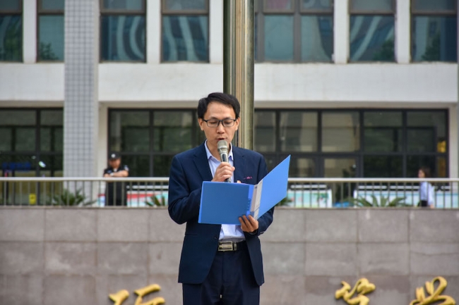 校团委组织部薛子豪老师宣读新团员名单,副校长陈静和在场教师为220名新团员佩戴团徽。