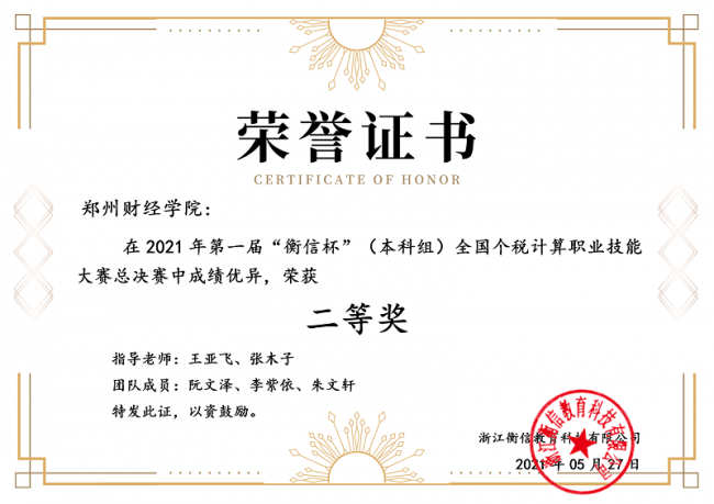 会计学院学子在第一届“衡信杯”(本科组)个税计算职业技能大赛总决赛中喜获二等奖