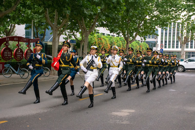 7点20分,升旗仪式正式开始。伴随着嘹亮的口令,国旗护卫队护旗手迈着沉稳矫健的步伐入场。《义勇军进行曲》奏响,全体师生行注目礼,高唱国歌,五星红旗冉冉升起。