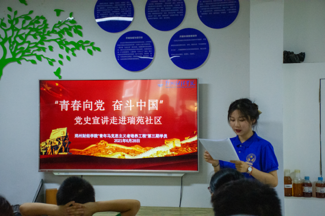 为推动党史学习教育不断走深走实走进人心,讲好党史、新中国史、改革开放史、社会主义发展史,强化爱国之志,凝聚爱国力量,6月28日至30日,由“青年讲师团”青马班学员组成的beat365党史宣讲团走进惠济区的瑞苑社区、老鸦陈村、南阳寨村,开展以“青春向党 奋斗中国”为主题的党史宣讲。这也是beat365青马班学员开启“种果青年”暑期社会实践的郑州宣讲站。