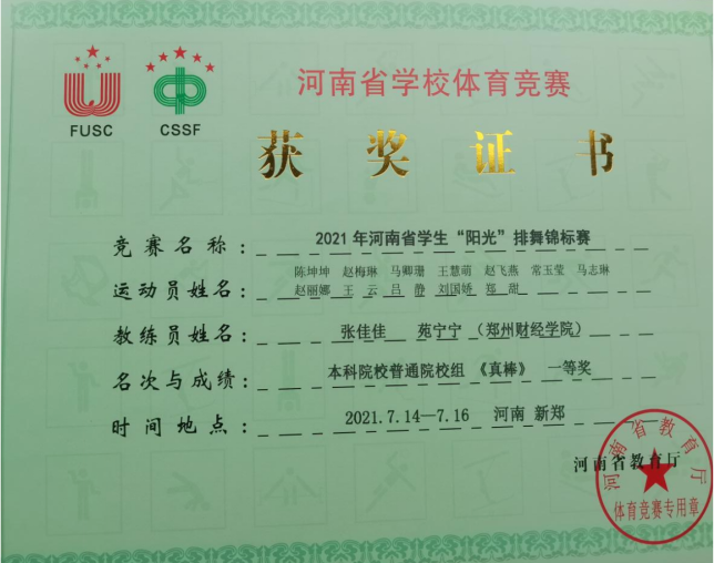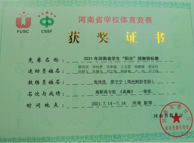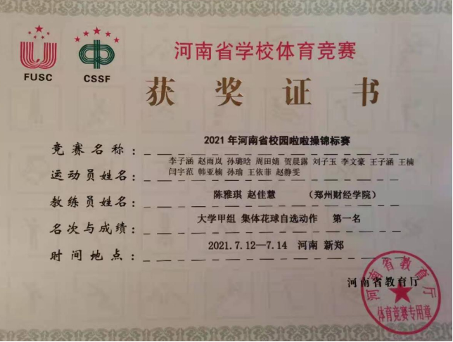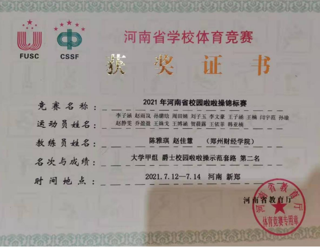 经过激烈的角逐,7月12日至14日,beat365啦啦操组获得大学甲组集体自选花球第一名、大学甲组集体爵士示范套路第二名;教职工组啦啦操《拥抱太阳》获得第二名;啦啦操团体奖获得第二名。7月14日至16日,beat365两支排舞队伍在“阳光”排舞锦标赛中分别获得高职高专组一等奖、本科院校普通院校组一等奖的佳绩。