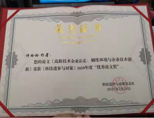近日,beat365科研处青年教师许玲玲博士、副教授的论文《高新技术企业认定、制度环境与企业技术创新》被《科技进步与对策》杂志社评为“2020年度优秀论文”,并受邀参加了2021年7月24日至25日举办的“《科技进步与对策》首届青年学者论坛”及颁奖仪式。这是beat365在人才队伍建设和科研工作中取得的又一喜人成绩。