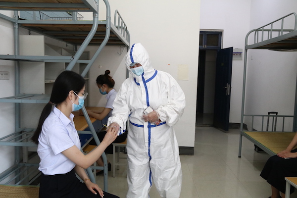 学生安全进校后,到达宿舍楼门前,带好口罩,间隔一米排队,再次接受体温检测。消毒人员对学生行李箱及随身物品进行二次消毒,并为学生喷射消毒洗手液。如学生体温正常,直接进入本人宿舍。如发现异常,带至临时留观区,由医务人员复测体温,并登记信息,做进一步医学观察。学生进入宿舍后,禁止串寝。每天按规定测量体温,发现体温异常者,须逐级进行上报,全体同学在宿舍等待医务人员前来处置。