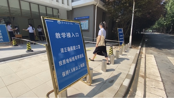 上课时,师生须佩戴口罩进入教室,按照地标线指示间隔1米以上有序排队,接受检查。不得聚集闲聊,依次经过教学楼入口处接受体温检测。核查员为学生喷射洗手液,体温正常者可直接进入教室。按照桌面指示标记就坐,开展教学活动。发现体温异常者或自觉不适时,应立即报告任课老师及辅导员,医务人员前来复测体温,带至临时隔离区留观。辅导员做好患病学生追踪管理,做好同班学生症状检测和心理稳定工作。