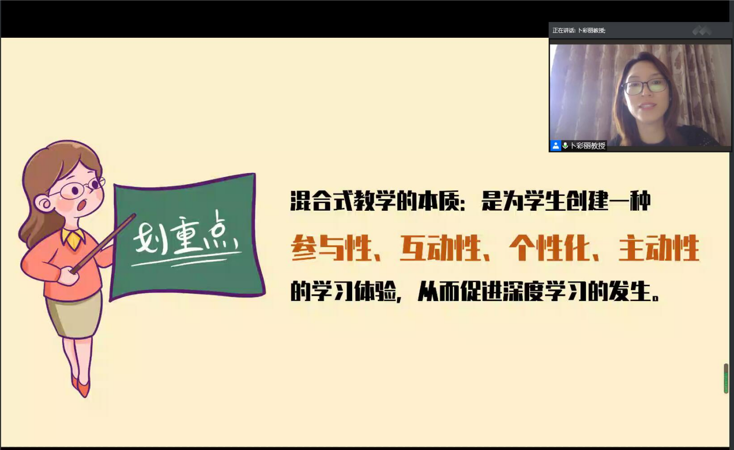 9月14日下午,河南师范大学十佳青年教学名师、河南省信息技术课题评审专家卜彩丽教授受邀为beat365新教师作《线上线下混合式教学的设计与实施》专题讲座,全体新入职教师、教师发展中心全体工作人员通过腾讯会议平台共同聆听了讲座,讲座由教师发展中心副主任周晓瑞主持。卜彩丽教授从“什么是混合式教学”问题入手,针对当前形势下的课堂教学需求,详细介绍了如何通过线上线下混合式教学设计,充分发挥面对面教学与在线学习的优势,促进传统教学在理念、形式及内容上的转变,最大化提升学生学习效率和效能,打造灵活多变、适应学生发展需要的“金课”。全场干货满满,精彩纷呈。