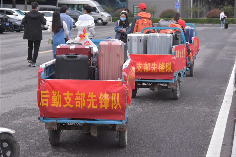 为避免人员聚集,返校学生需要自己搬运行李进入校园,家长尽快离开校门口,减少逗留时间。考虑到行李繁多不便随身携带,保卫处志愿者服务队、后勤支部先锋队用电动车帮助学生运送大件行李,往返于校门口和宿舍楼之间,用细致周到的服务迎接学生返校。