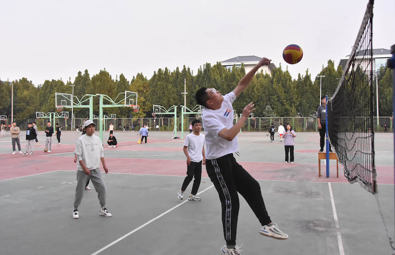 开幕式后,各二级学院参赛队员在排球场积极训练,为拿下首场比赛的胜利做准备。