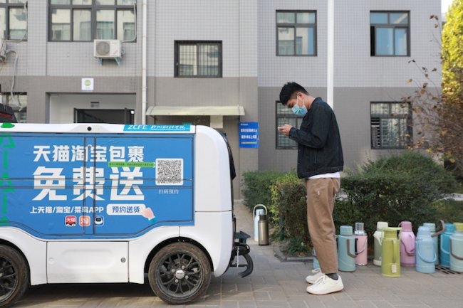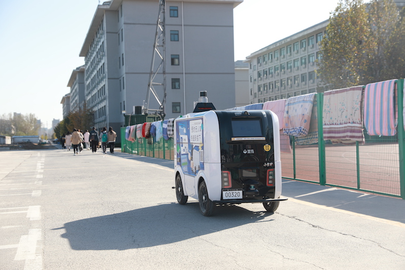 时尚的造型、一路温馨的语音提示,让无人派送车成为校园里一道独特的风景。