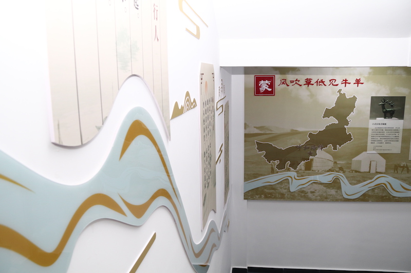 “黄河文化”墙依托图书馆南侧一楼至六楼步梯墙面而建,以黄河流经9个省份的文化为轴线,由11面横墙和10面斜墙组成。横墙图文并茂地介绍了沿黄河9省出土的珍贵文物,如黄金面具、鹰顶金冠、武曌金简、彩陶双连壶等,并详细标注文物的现存场馆,直观呈现不同地区的风貌文化及其特征。斜面墙展示了27首描写黄河文化的名家诗篇,其中一个墙面展出了部分珍贵文物1:1的复刻品。从图书馆六楼缓步而下,“黄河之水天上来”“风吹草地见牛羊”……朗朗上口的诗句、丰富多彩的人文地貌,黄河文化如同奔腾流淌在墙上一般,吸引广大师生驻足观看,细细品读。