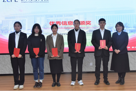 最后,副校长张顺利作总结讲话。他对受表彰的学生及新聘的信息员表示祝贺,强调学生教学信息员是教学质量监控的重要组成部分之一,是加强校风学风建设的重要组成内容。并对学生教学信息员提出了四点希望,第一,广大学生教学信息员要做好学生学业信息传递的使者,做好受教育者和监控者的“双重角色”。第二,做好学生和学校之间的纽带,将学生意见反馈至学校的同时,也要及时将学校的方针政策和相关动态反馈至学生。第三,了解自己崇高的职责,树立主人翁意识,认识到所肩负的责任和使命,关心学校的建设和发展。第四,认同自己的角色定位,对同学们学习过程中存在的问题和困难及时收集反馈,做好信息“过滤器”。激励同学们做爱在郑财的传承者、学在郑财的示范者、业在郑财的先行者和美在郑财的领航者。