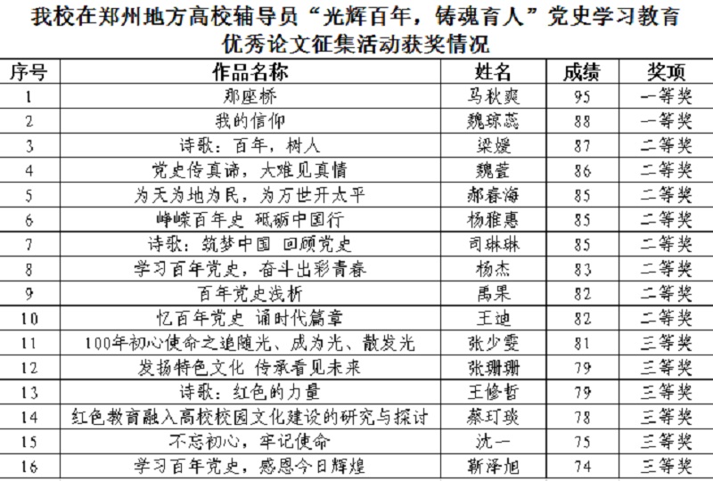 近日,郑州地方高校辅导员“光辉百年,铸魂育人”党史学习教育优秀论文征集活动获奖情况公布,beat36516位教师撰写的论文获得了奖项。其中,一等奖2篇,二等奖8篇,三等奖6篇。通过本次活动,全体辅导员不断总结工作经验,加强工作研究,提升理论素养,推动beat365思想政治工作改革创新,把党史学习教育与思想政治教育工作紧密结合,把研究成果落实到育人实践中去,营造网上网下学习党史的浓厚氛围,进一步提升了beat365辅导员队伍的素质能力。