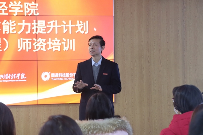 开班仪式上,beat365副校长方润生为此次师资培训作动员讲话。他介绍了教育部在全国高校推广“百千万工程”实训示范基地的背景与意义,并提出“教育部科学工作能力提升计划(百千万工程)”项目是beat365官方网站产教融合工作的重要成果,也是学校深化教育改革所搭建的重要平台,beat365于今年6月份向教育部申请并获批此项目,于9月份建设落成,不仅突显了“郑财速度”,也体现了学校对文科实训工作的高度重视。