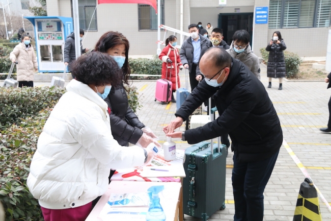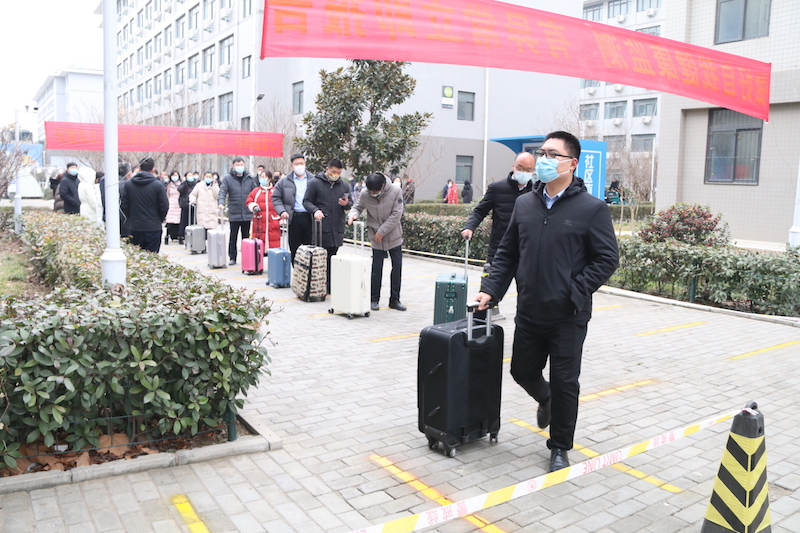 学生安全进校后,到达宿舍楼门前,带好口罩,间隔一米排队,禁止聚集聊天,依次等候接受体温检测。消毒人员对学生行李箱及随身物品进行消毒,并为学生喷射消毒洗手液。如学生体温正常,直接进入本人宿舍并正常开展学习生活。如发现体温异常者,带至留观区等待进一步医学检查。