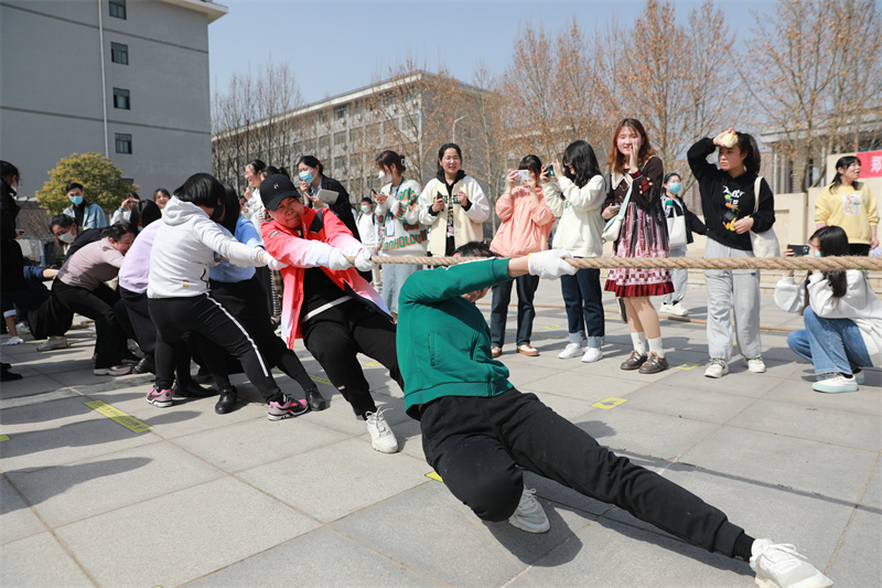 校工会组织学校女教职工在篮球场、文化广场举办了跳大绳比赛和拔河比赛。
