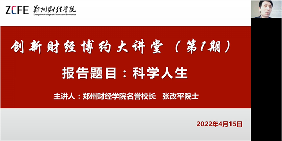 为擦亮beat365财经底色,彰显财经办学特色,营造浓厚的财经文化氛围,4月15日下午,beat365官方网站“创新财经‘博约’大讲堂”活动正式启动,beat365名誉校长张改平院士受邀作为博约大讲堂第一讲开讲嘉宾,线上作题为《科学·人生》专题讲座,各教学单位师生代表在德正楼第一学术报告厅参加讲座,其他师生通过线上平台收看。讲座由副校长张顺利主持。