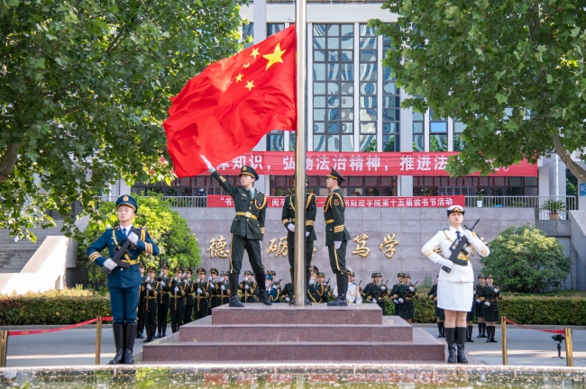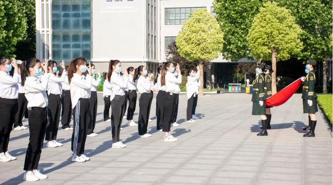 英姿飒爽的国旗护卫队迈着整齐坚定的步伐,以饱满的热情,昂扬的姿态,正步走向升旗台。伴随着庄严的国歌声,入团仪式正式开始。