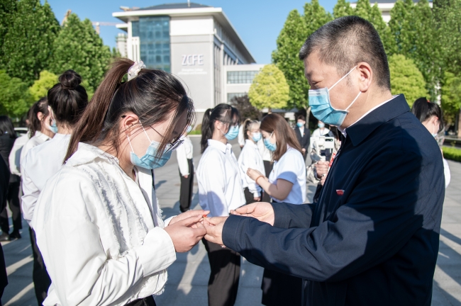 监事会主席李庆阳、副校长陈静和在场教师为新团员佩戴团徽。