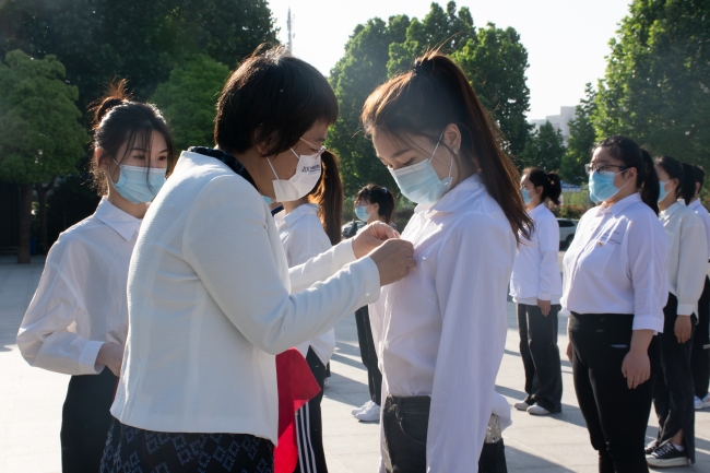 副校长陈静为新团员佩戴团徽