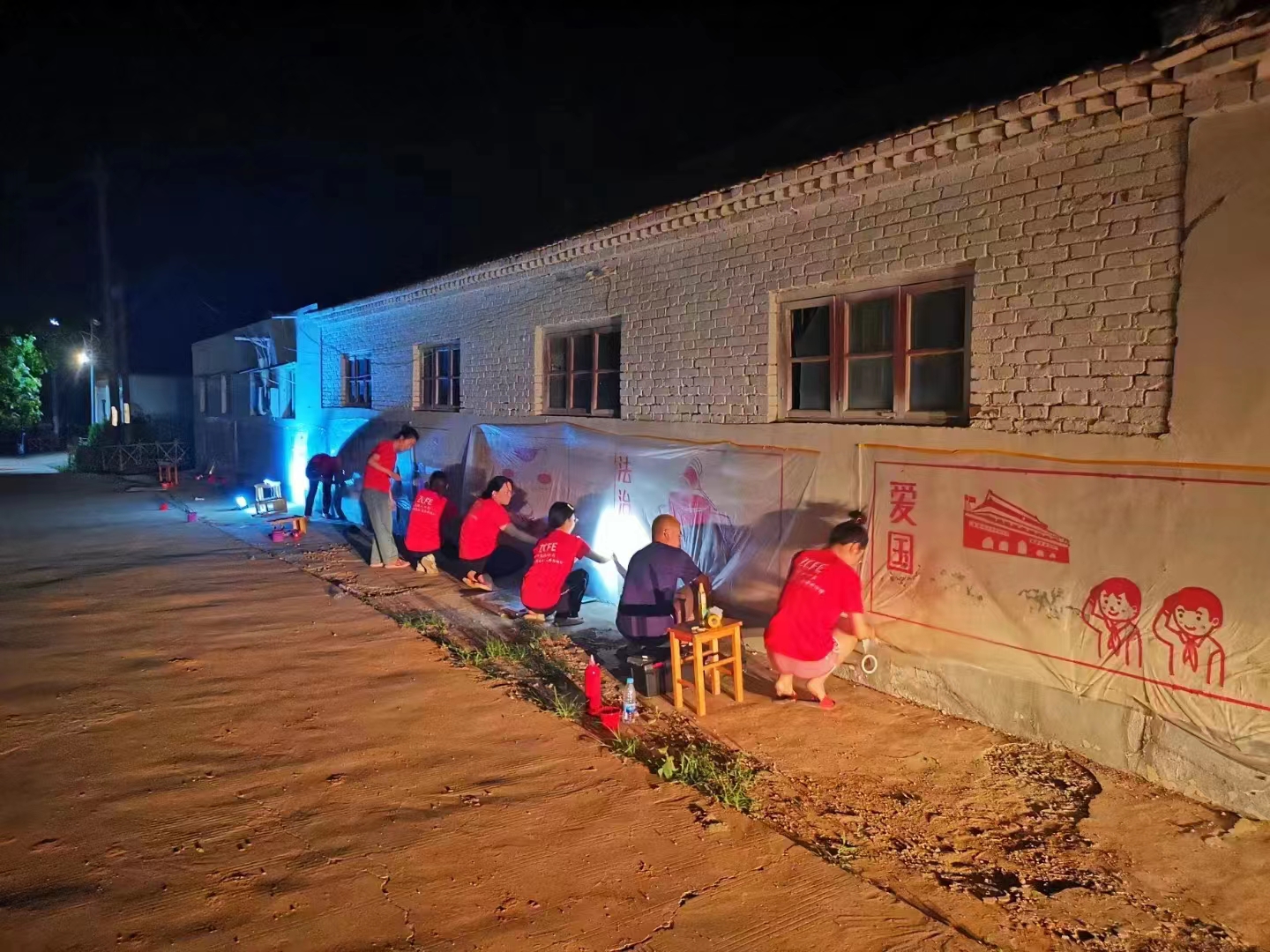 彩绘文化墙环节,团队以“乡村振兴、建设美丽乡村”为出发点和落脚点,旨在通过墙绘来表达、展现出乡村的内在精神风貌。团队成员不畏炎热,在室外环境下认真构图、填色、勾边、完善细节,以墙绘为载体,充分利用方寸间的文化墙,将乡村振兴主题、社会主义核心价值观等内容生动展现出来,墙绘面积达800平方米。