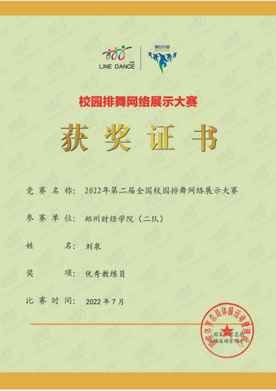 刘泉老师获得“优秀教练员”证书