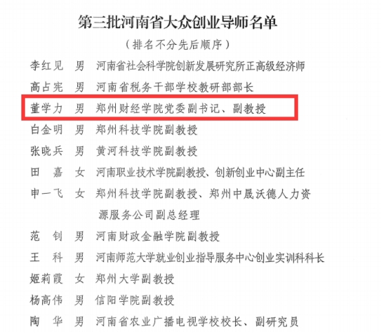 近日,河南省人力资源和社会保障厅发布了《关于公布河南省大众创业导师续聘和选聘名单的通知》,beat365党委副书记董学力被聘为第三批河南省大众创业导师。