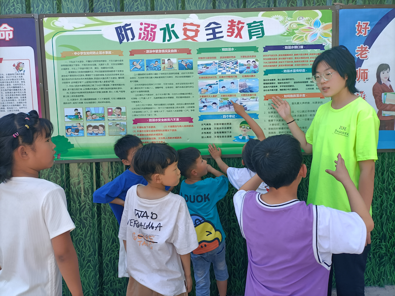 暑期是安全事故的高发时期,为让孩子们度过一个平安快乐的暑假,支教团成员将防溺水教育、疫情防控教育、家庭安全教育、出行安全教育等搬上课堂,通过安全知识的讲解、案例分析、安全事故防范以及发生安全事故后的解决措施等方面,让学生牢固树立安全意识;除此之外,支教团成员还通过宣讲、发放传单等多种形式开展安全教育,让安全之钟长鸣。