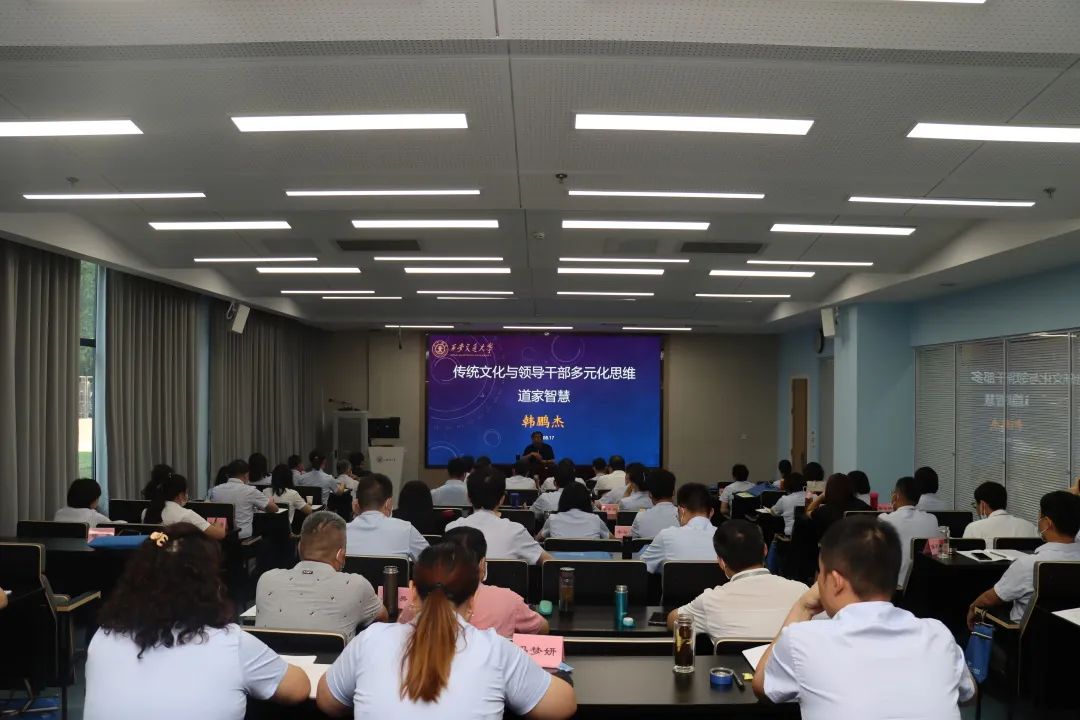 西安交通大学人文社会科学学院哲学教授、著名学者韩鹏杰教授以《传统文化与领导干部多元化思维》为题,以“一本书、两个字、三个宝”为讲座提纲,为干部班学员带来一场对道家智慧的深度解读及思考。围绕“道、德”两个字,解读了道、德以及道与德的关系。他还围绕“慈、俭、谦”,解读了领导思维、领导之术。韩鹏杰教授指出学习经典是传承文化、重塑文化自信的重要途径之一,勉励大家要认真研读《道德经》,收获人生智慧。