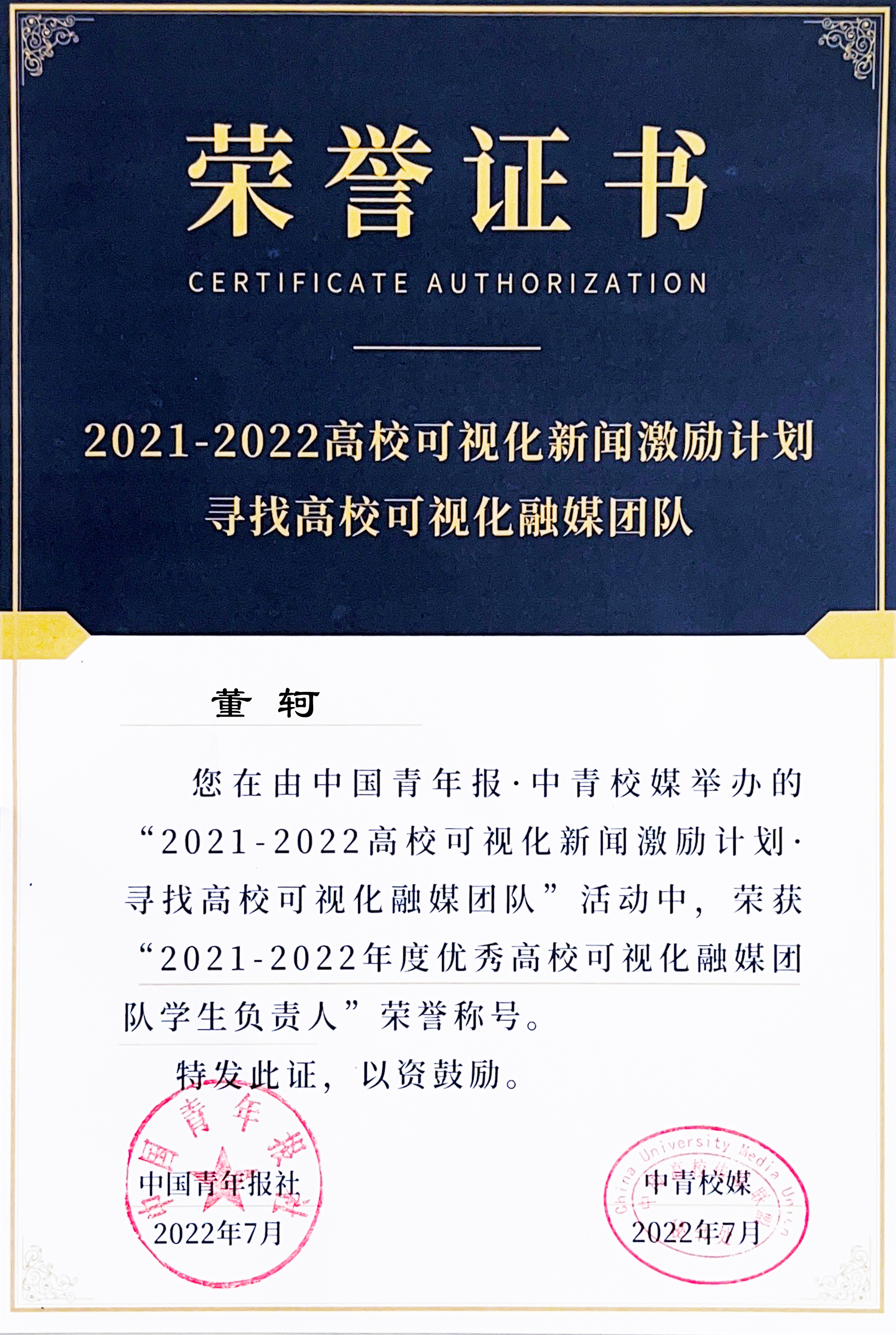 董轲荣获“2021-2022年度优秀高校可视化融媒团队学生负责人”荣誉称号