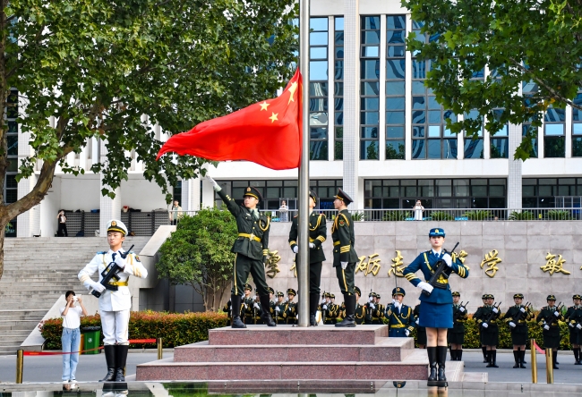 飒爽英姿的国旗护卫队迈着铿锵有力的步伐,以昂扬的姿态,饱满的斗志正步走向升旗台。伴随着庄严的国歌声,全体师生奏唱国歌,迎国庆升旗仪式正式开始。