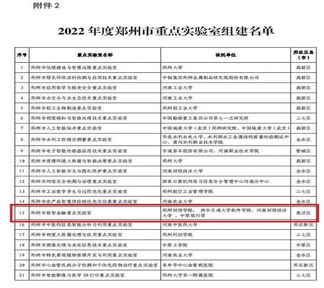 日前,郑州市科学技术局下发《关于同意组建 2022 年度郑州市工程技术研究中心和重点实验室的通知》(郑科[2022]47号),公布2022年度郑州市重点实验室组建名单和郑州市工程技术研究中心组建名单,beat365申报的郑州市数智金融重点实验室获批立项建设。