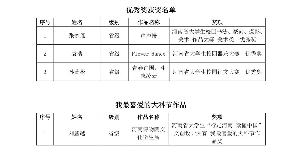 作品《岳阳楼记节选》获书法大赛一等奖,作品《戏台》获征文大赛一等奖,作品《豫见麦秆画》获融媒体作品大赛短视频类一等奖,作品《河南博物院文化衍生品》获文创设计大赛一等奖,作品《河南博物院文化衍生品》获“我最喜爱的大科节作品”奖。李静怡、王青等老师荣获“优秀指导老师”称号。