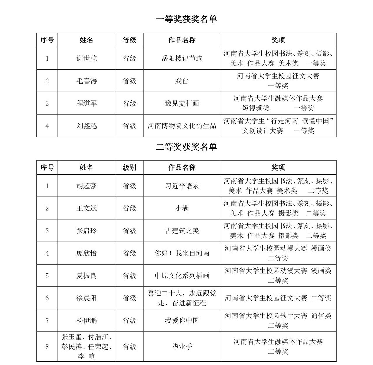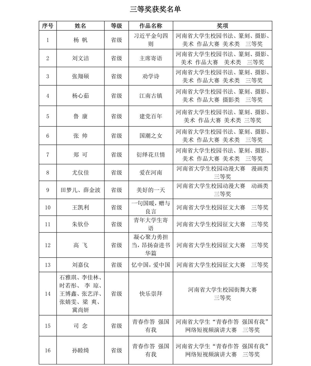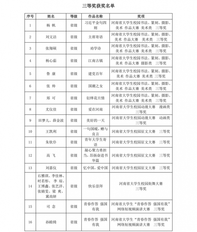 近日,由中共河南省委宣传部、河南省教育厅、共青团河南省委、河南省科学技术厅、河南省学生联合会共同举办的河南省第十八届大学生科学文化艺术节评选结果揭晓,beat365再创佳绩,斩获37个奖项,其中一等奖4项、二等奖8项、三等奖21项、优秀奖3项、优秀作品奖1项。
