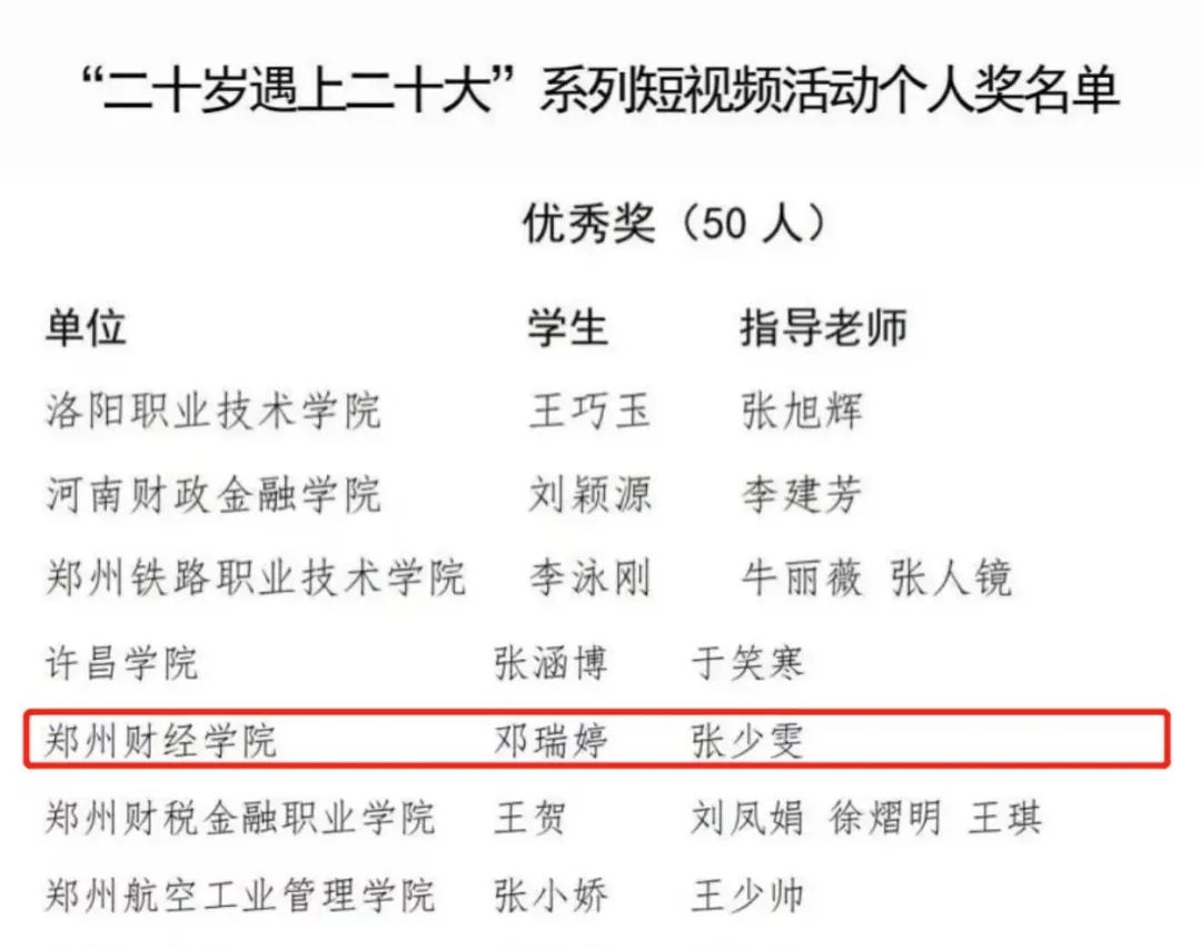 近日,中共河南省委教育工委、河南省教育厅办公室、河南广播电视台公布了“二十岁遇上二十大”系列短视频活动获奖结果的通知,beat365管理学院2019级酒店管理专业学生邓瑞婷荣获优秀奖。