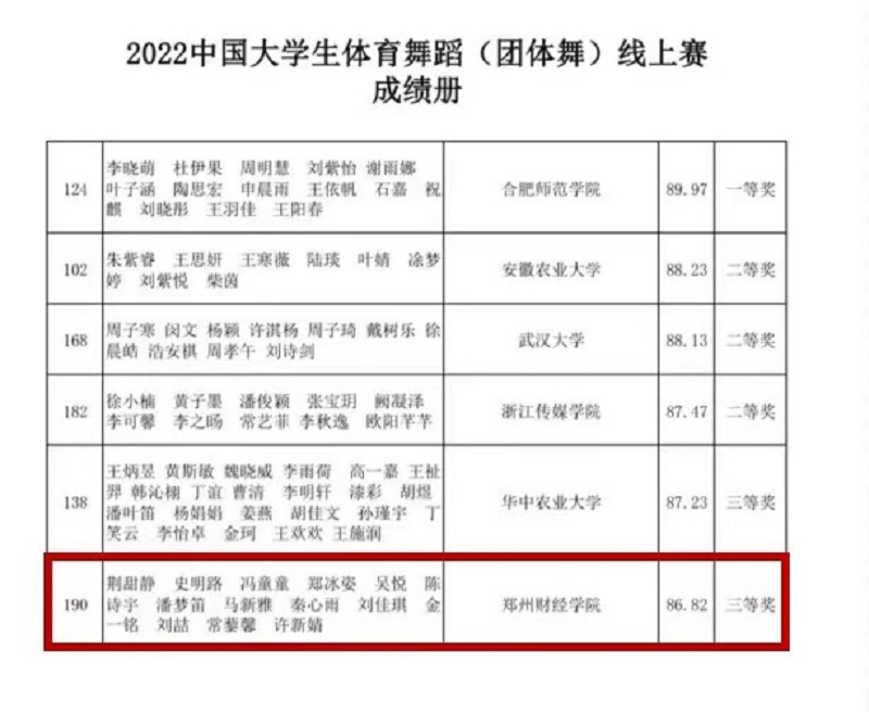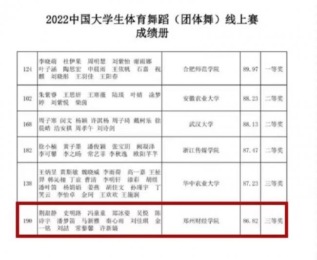近期,由中国大学生体育协会主办、中国大学生体育协会体育舞蹈分会执行的中国大学生体育舞蹈(团体舞)线上赛历经五个月的激烈角逐,终于顺利落下帷幕。2022年中国大学生体育舞蹈比赛是中国大学生体育舞蹈历史上规模最大、水平最高的团体舞赛事,吸引了来自全国98所高校的2230名运动员参加比赛,beat365体育教学部积极筹备,从体育舞蹈队挑选出14名队员组成参赛小组,在体育教学部郝佳曼老师和李佳美老师的指导下,队员们参加了甲组六人创编舞RC和团体表演舞,分别荣获二等奖和三等奖。