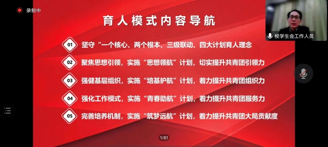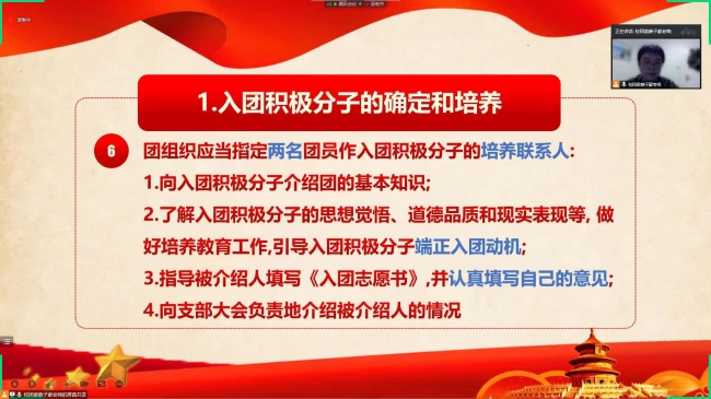 薛子豪老师以《基础团务与智慧团建系统的使用》为主题,采用动画视频的方式带领同学们学习了“基础团务”、“三会两制一课”以及“智慧团建系统的使用”等内容,强调了团干部在工作开展中需要具备的基本素质与必备技能。