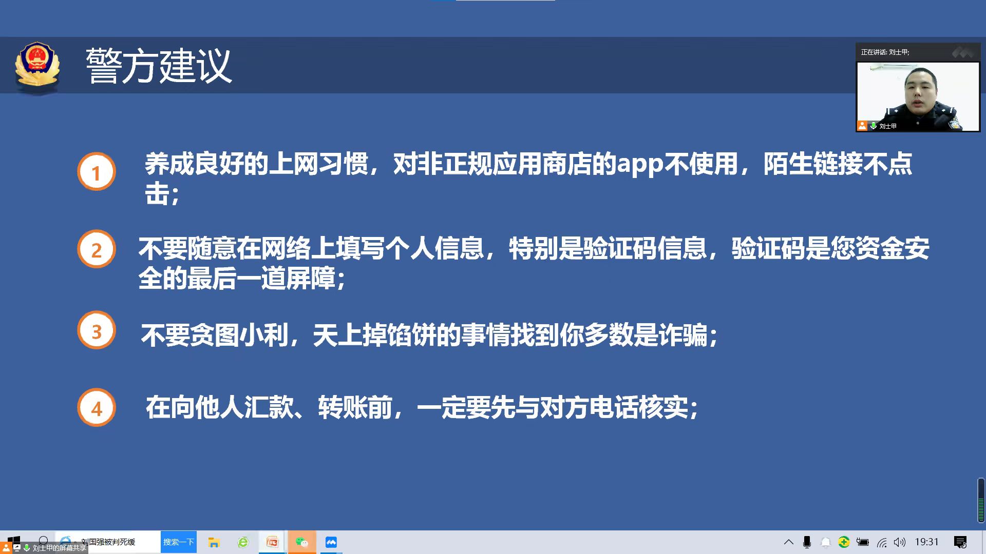 郑州市惠济区公安局警官刘士甲以“预防诈骗,提高安全意识”为切入点,开展了以《防电信网络诈骗校园宣传》为主题的团课培训,主要从什么是电信诈骗、电信网络诈骗的特点、诈骗窝点向境外蔓延、与校园相关的诈骗手段以及警方建议五个方面对beat365学生进行培训,切实提高学生防诈骗安全意识,维护校园安全稳定。