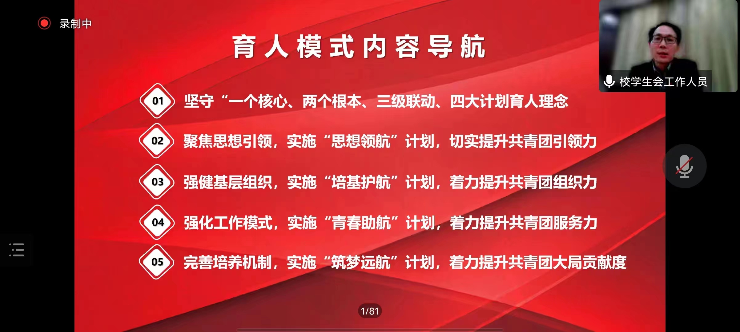 为深入学习习近平新时代中国特色社会主义思想,学习宣传贯彻党的二十大精神,深入推进共青团深化改革,加强团干部能力作风建设,11月,校团委通过线上线下相结合的方式开展了主题为“学习二十大、永远跟党走、奋进新征程”2022年秋季团课培训,进一步聚焦主责主业,强化思想引领,引导广大青年团员听党话、跟党走。