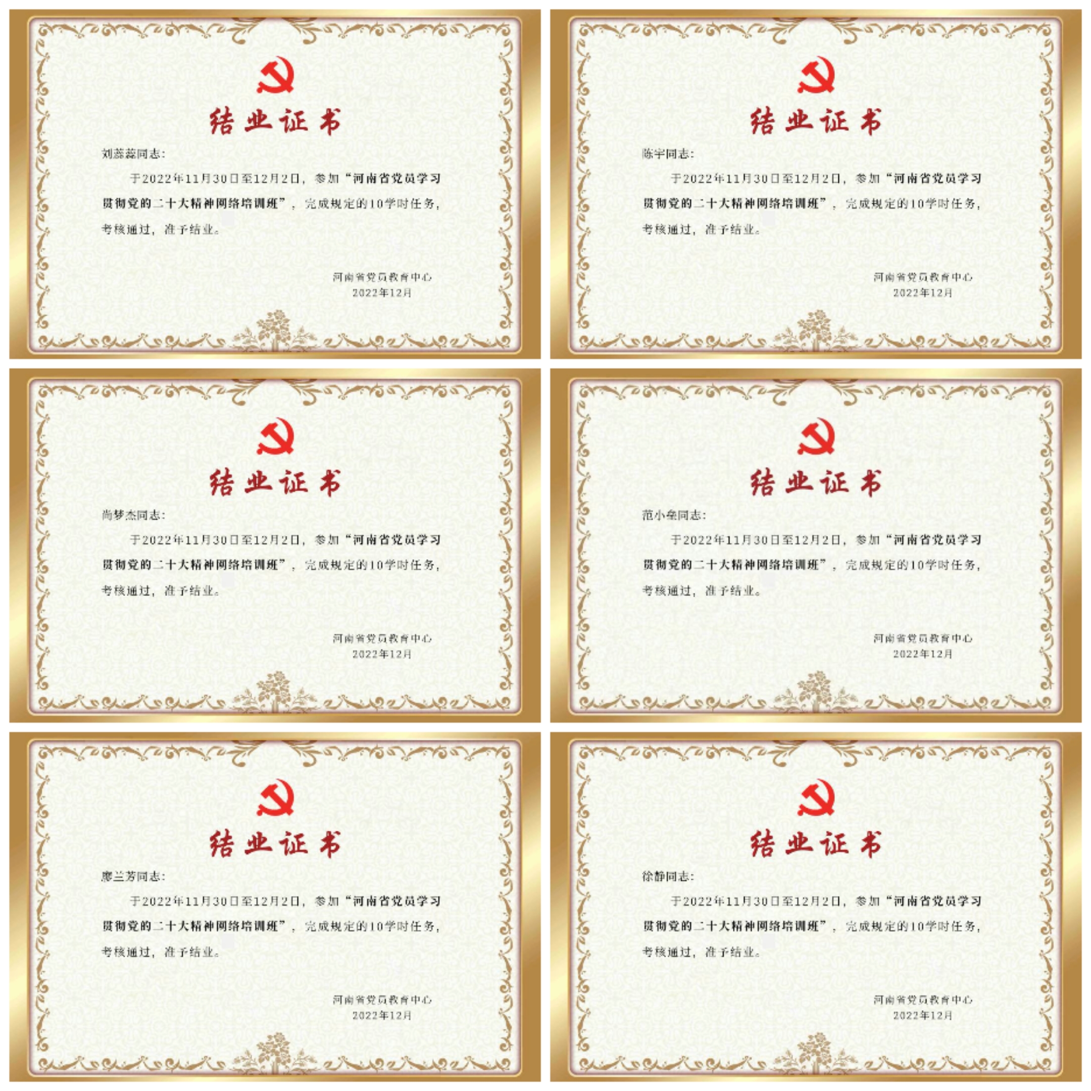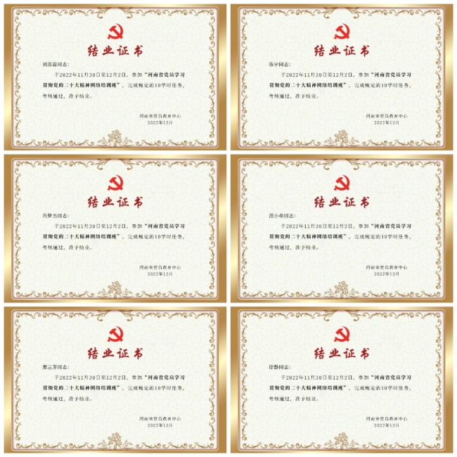 此次网络培训班实行“线上授课+在线考试”形式进行。beat365师生党员积极参与,认真学习,完成了全部课程和学时要求,并顺利通过线上考试,获得了河南省党员教育中心颁发的结业证书。