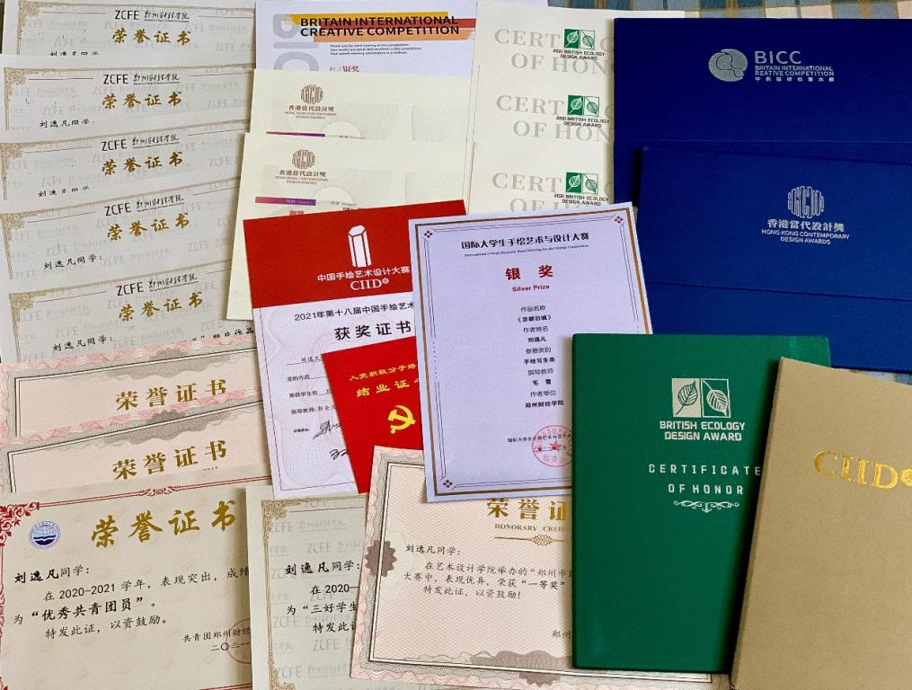 入学以来,秉持对艺术的热爱,脚踏实地夯实专业基础,活跃在各大比赛现场,投身志愿服务展现青年担当,艺术设计学院刘逸凡同学用艺术之笔绘制了一份优秀的青春答卷。“成功的花儿,人们总惊羡它现时的明艳,然而当初,它的芽儿浸透了奋斗的泪水,洒遍了牺牲的血雨。”这正是对刘逸凡一路披荆斩棘,最终拿下国奖的最好诠释。