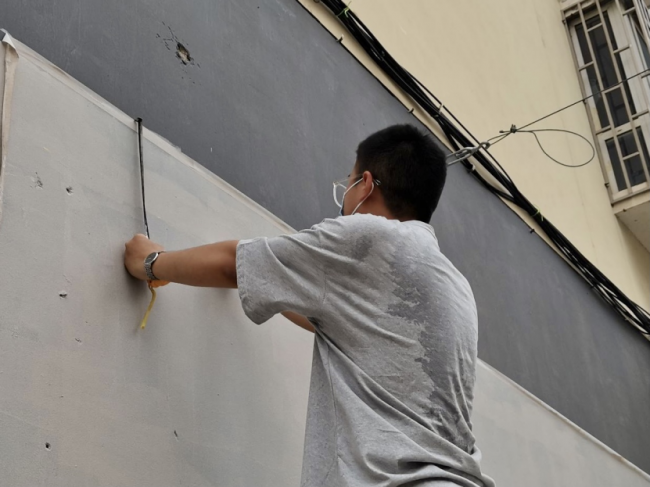 刘逸凡参加盖世英雄美术公益团测量定位时汗流浃背