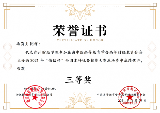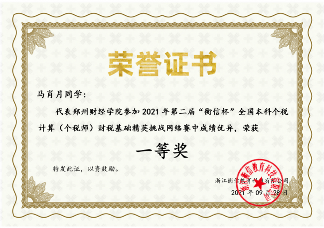 马肖月获得2021年第二届“衡信杯”全国本科个税计算财税基础精英挑战网络赛一等奖
