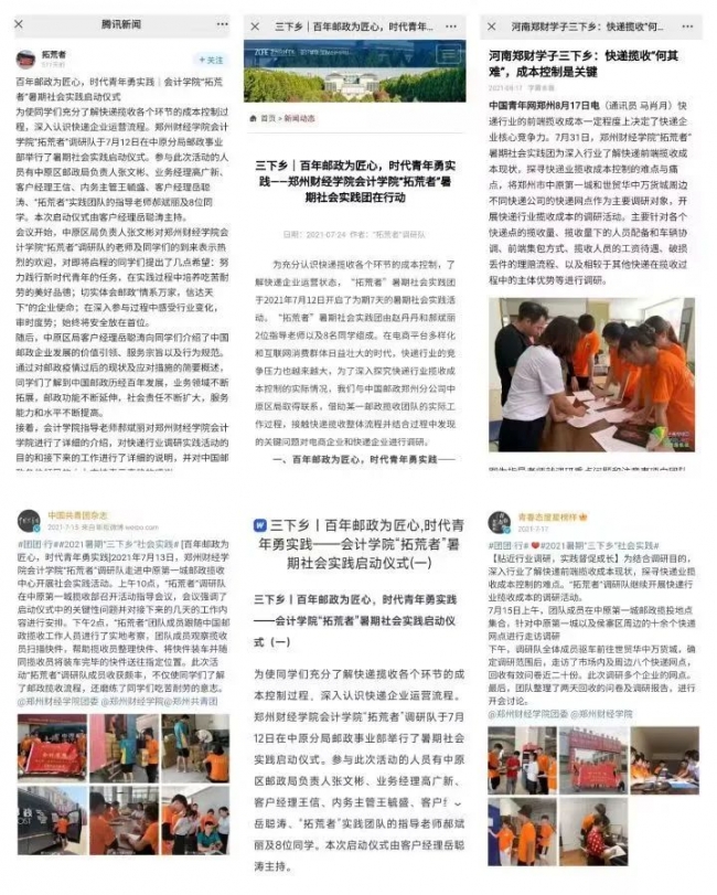 马肖月还承担了实践团的新闻宣传工作,由她撰写的稿件、拍摄的图片、剪辑的视频多次被学校官网、中青校园、今日头条、腾讯新闻、一点资讯、百度文库等媒体推送发布。她表示,通过暑期社会实践,自己更“接地气”了,第一次了解到一个行业的发展趋势,也深刻感受到时代发展对电商平台和快递行业的巨大影响,也更加坚定了只有脚踏实地学好本领,才能立足社会、服务社会。