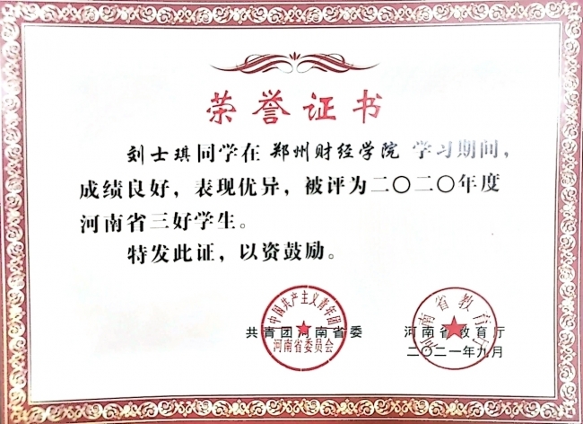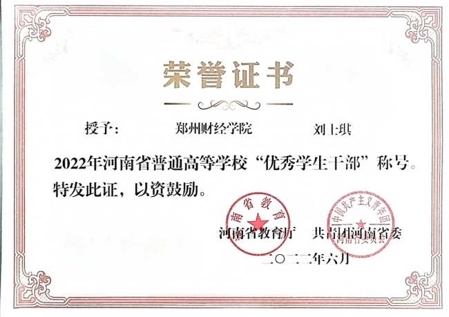 以今日为舞台,展现青春风采,以梦想为坐标,实现出彩人生。刘士琪收获了河南省“三好学生”、河南省“优秀学生干部”、郑州市“三好学生”以及beat365官方网站“三好学生”“优秀共青团干部”“校园十佳魅力团支书”“十佳团干”等荣誉。她锚定目标,不断攀登,让每一寸时光都有了意义,平凡的大学生活绽放出格外耀眼的光芒。谈及对自我的认知,刘士琪表示:“如果满分10分,会为自己打9分,因为每一段时光都有它存在的独特意义,从不后悔在大学里做的任何一件事情,这些经历让我成长了许多。但永远会剩余1分,因为知自身不足,仍需不断努力。”
