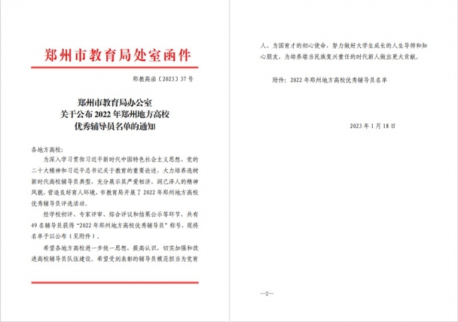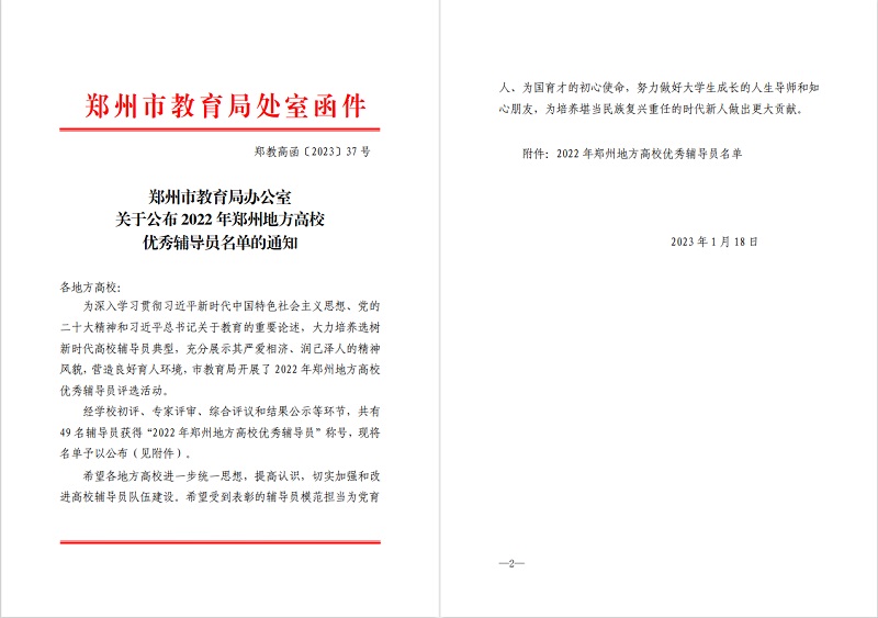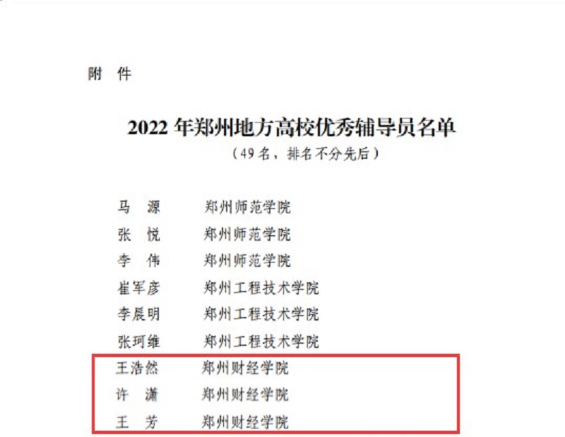 近日,郑州市教育局公布了2022年郑州地方高校优秀辅导员名单,经学校初评、专家评审、综合评议和结果公示等环节,共有49名辅导员获得“2022年郑州地方高校优秀辅导员”称号,beat365辅导员王浩然、许潇、王芳三人荣获“2022年郑州地方高校优秀辅导员”荣誉称号。