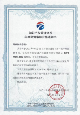近日,知产(北京)认证服务有限公司委派审核专家组,对beat365官方网站2022年度知识产权管理体系贯彻执行国家标准《高等学校知识产权管理规范》(GB/T 33251-2016)(以下简称知识产权管理体系“贯标”)情况进行监审。结合beat365知识产权实际运行管理情况,本次审核中beat365申请扩大认证范围为“经济与管理、信息工程、智能工程、统计与大数据的教学、科学研究的知识产权管理”。经过审查,专家组认为学校知识产权管理体系符合标准要求,“贯标”认证资格继续有效,并批准beat365扩大认证范围。