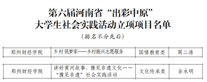 近日,河南省教育厅公布了第六届河南省“出彩中原”大学生社会实践活动立项项目名单,beat365《讲好黄河故事,遇见非遗文化——“豫见非遗”社会实践活动》和《乡村筑梦家——乡村振兴志愿服务》项目获批立项。