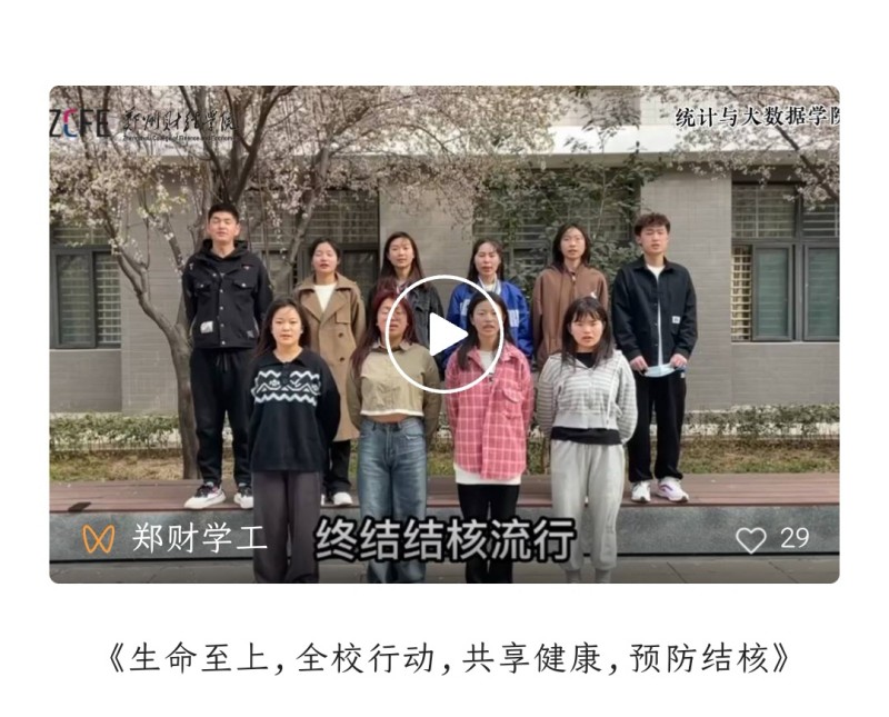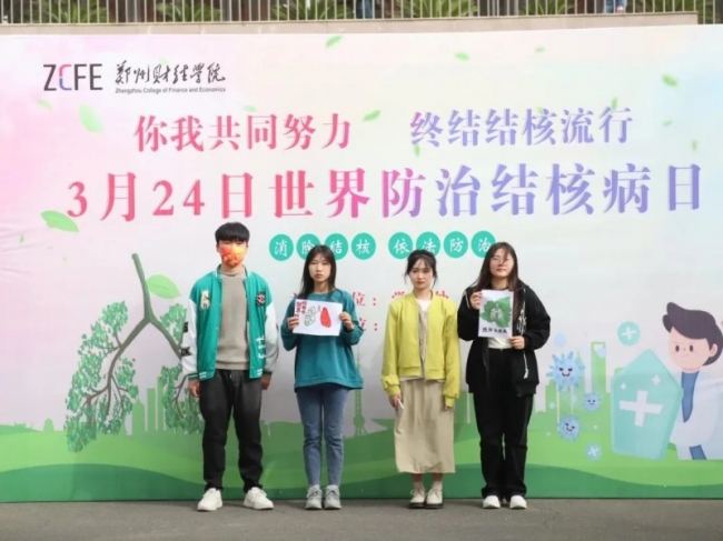 根据郑州市结核病百千万志愿者传播活动要求,beat365积极倡导大学生志愿者以“世界防治结核病日”为宣传主题在校园内多个地点进行打卡。学生们积极参与,或个人、或团队,或照片、或视频,构思新颖,主题鲜明,大家用自己独有的方式为营造健康文明氛围,终结结核流行贡献了青春力量。3月20日,各学院优秀作品被推送至“郑财学工”公众号,引起热烈反响,全校师生纷纷投票,取得了良好的宣传效果。