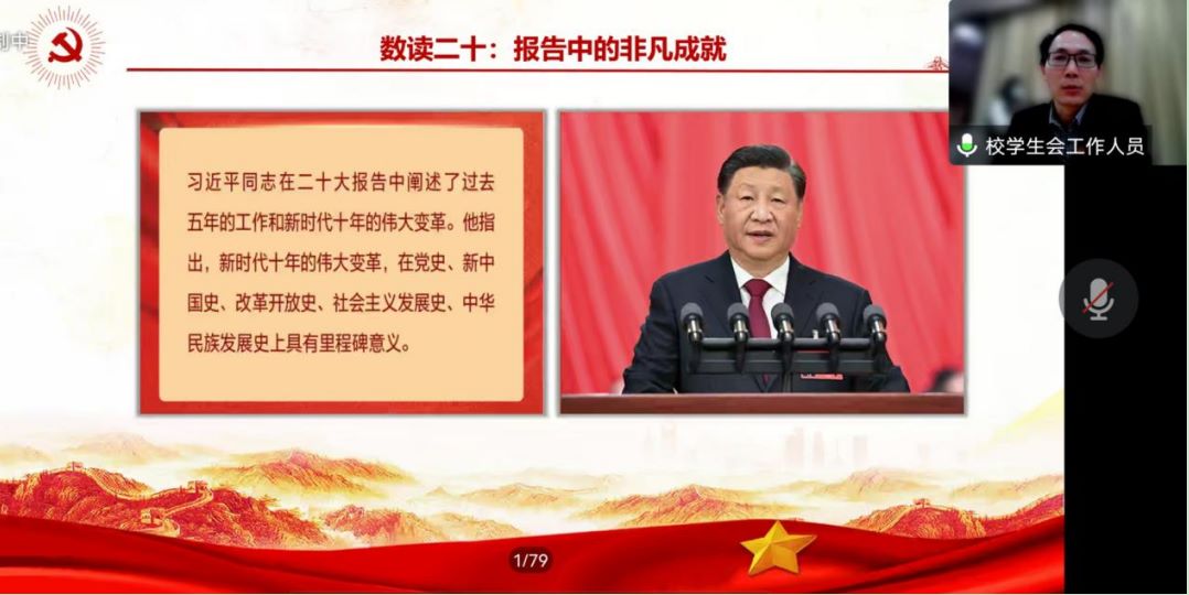 校团委书记周二涛以“学习二十大精神,做新时代好青年”为主题,从党的二十大盛况、团学组织架构、共青团1234模式、做最好的自己四个方面出发,全方面多层次地为学生讲述新时代背景下,做好时代青年的重要性。周书记指出,当代青年应以“听党话、跟党走、学党史、感党恩”为行动方向,他以举例的方式为学生详细讲解了团学组织架构的具体内容。